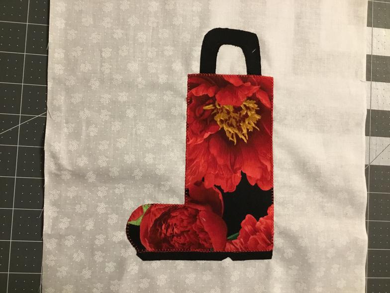 The block for February is a Boot. It is an appliqued block with a colorful gardening boot with a sole and handle of a contrasting color. Use a bright colorful boot on a white background. Finished size is a 10.5 inch square.