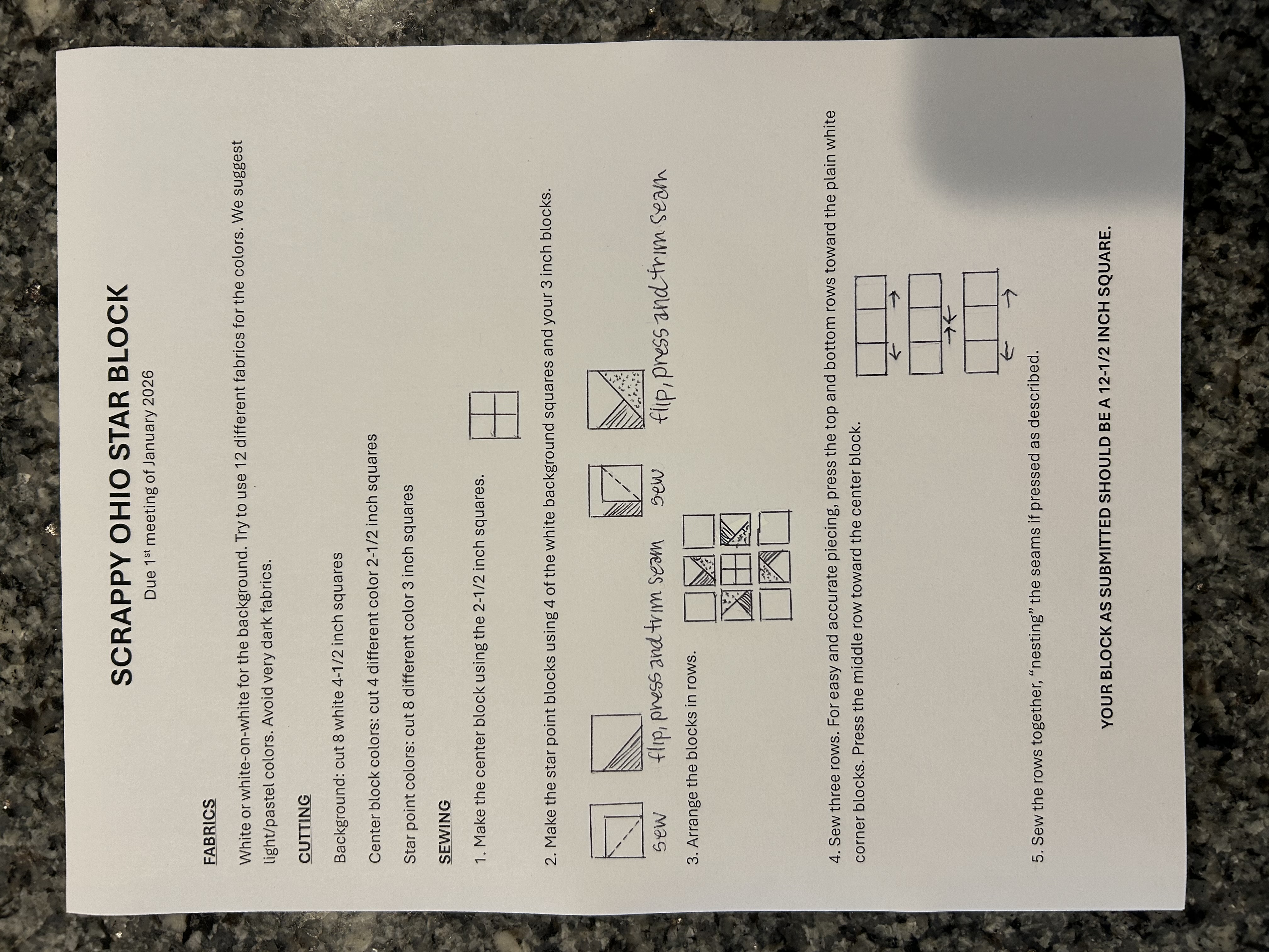 The block for January is a Scrappy Ohio Star Block. It is a pieced block using light/medium pastels on a white background. Finished size is a 12.5 inch square.