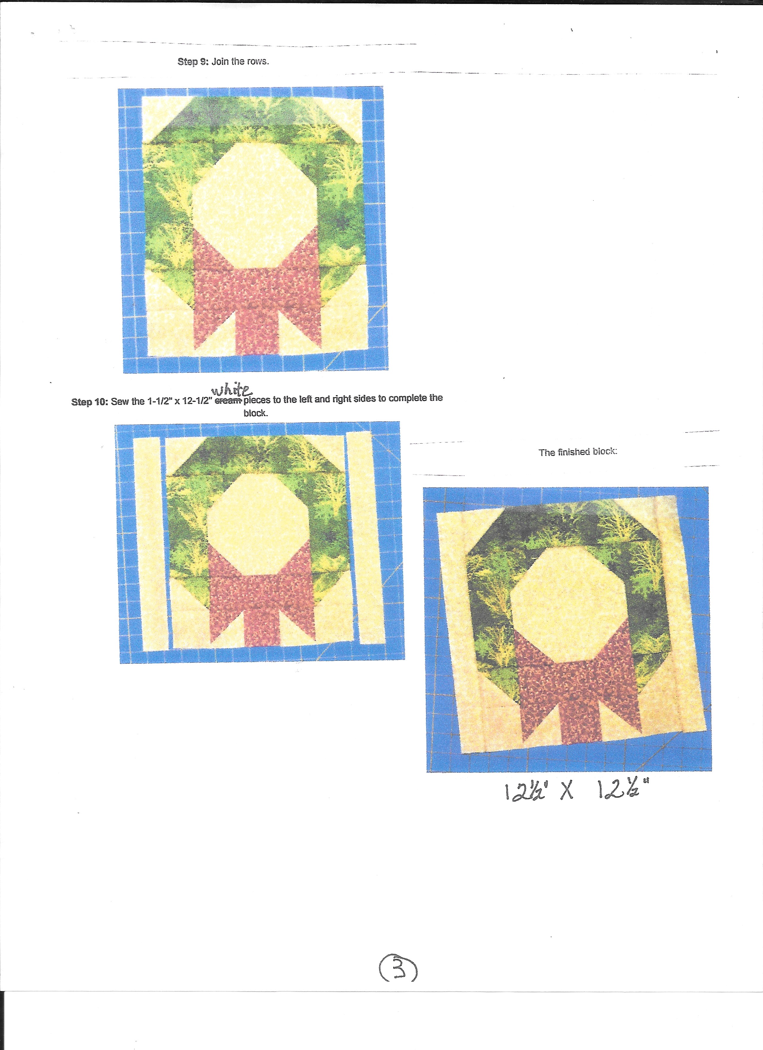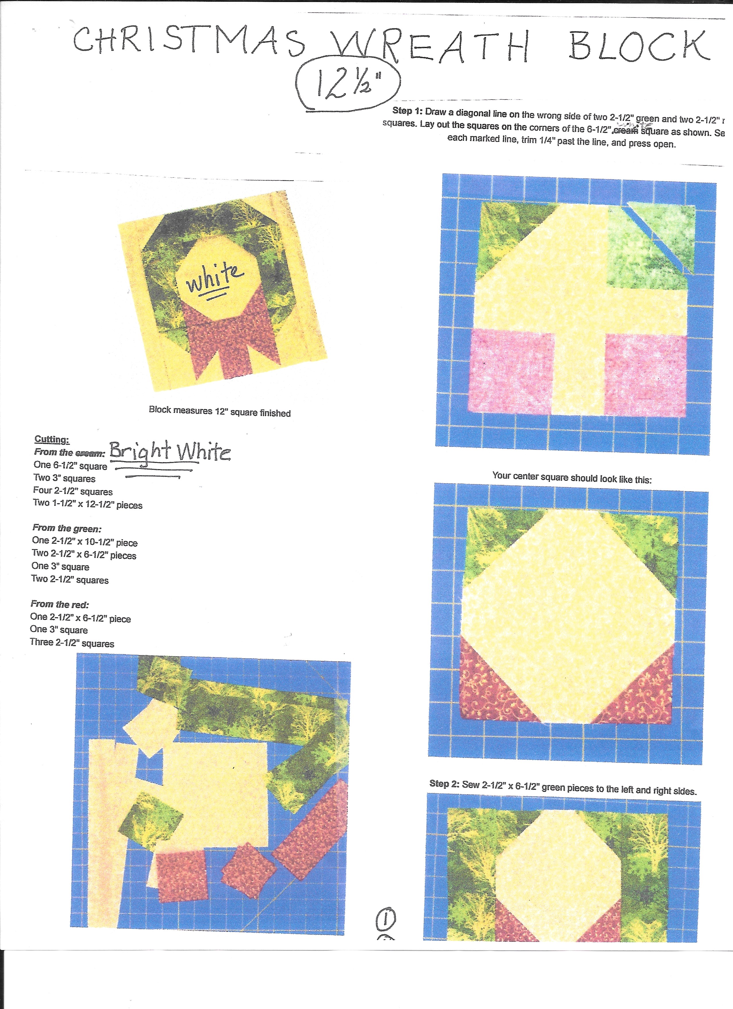 Christmas Wreath Block for Buck-A-Block event for our next Quilt Show. Nancy Hunt is leading the effort to make lots of Wreath Blocks with this pattern. Click to download a jpg copy of the instructions. Pg1 Pg2 Pg3