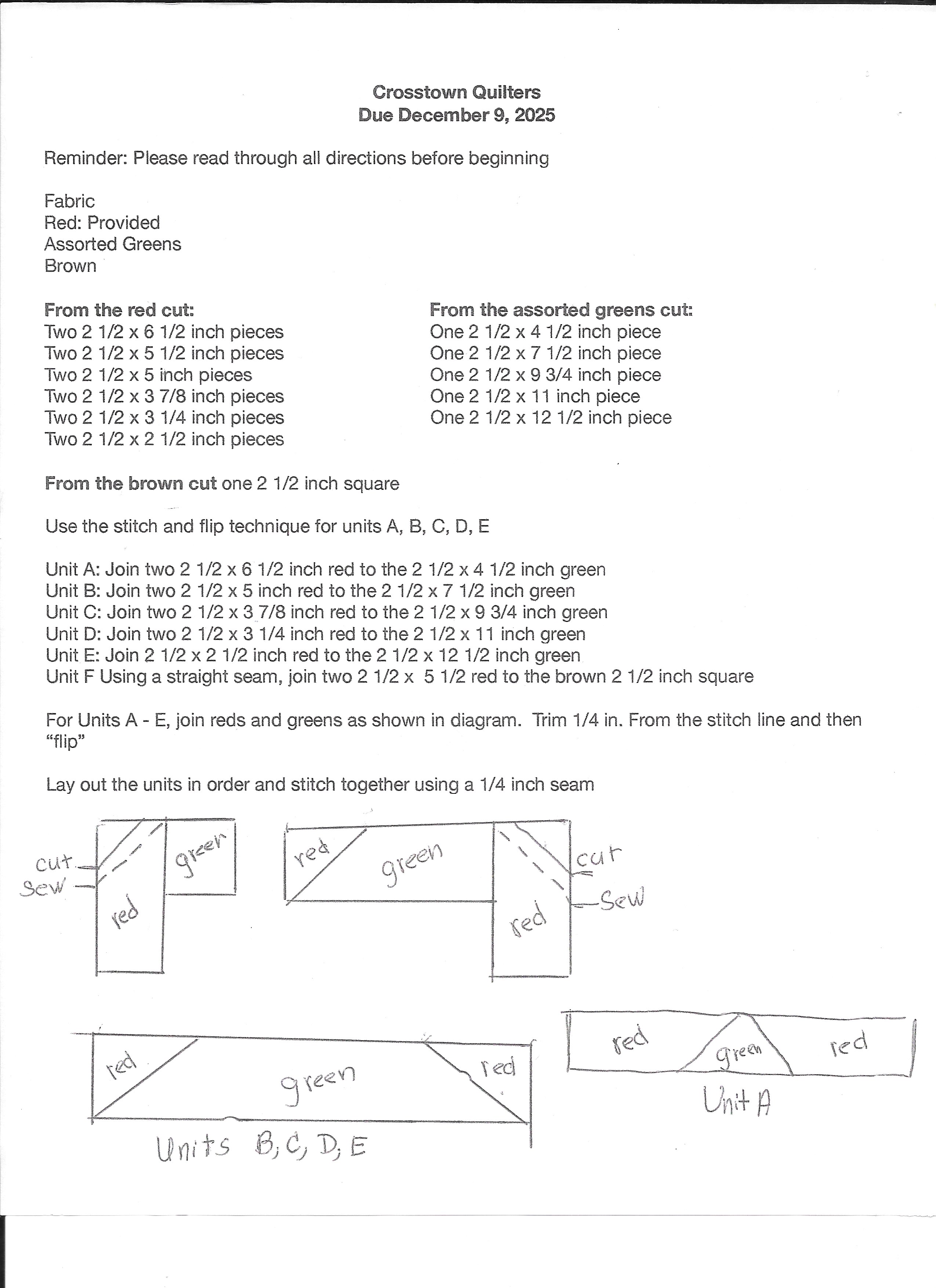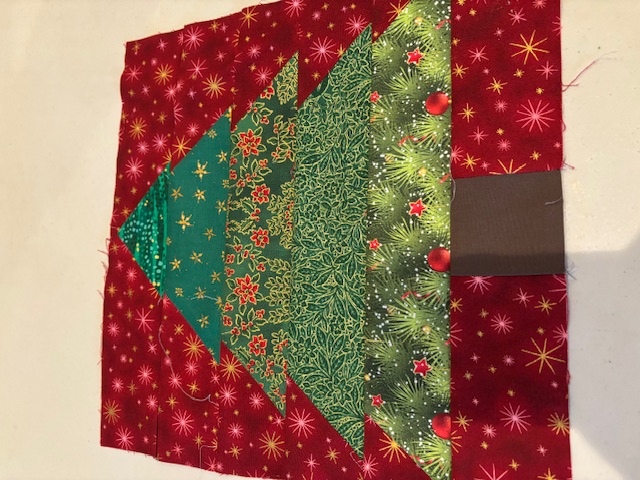 The block for December is a Christmas Tree. It is a pieced block using the red fabric provided at the Nov meeting and greens from your stash. Finished size is 12.5" x 12.5" square.